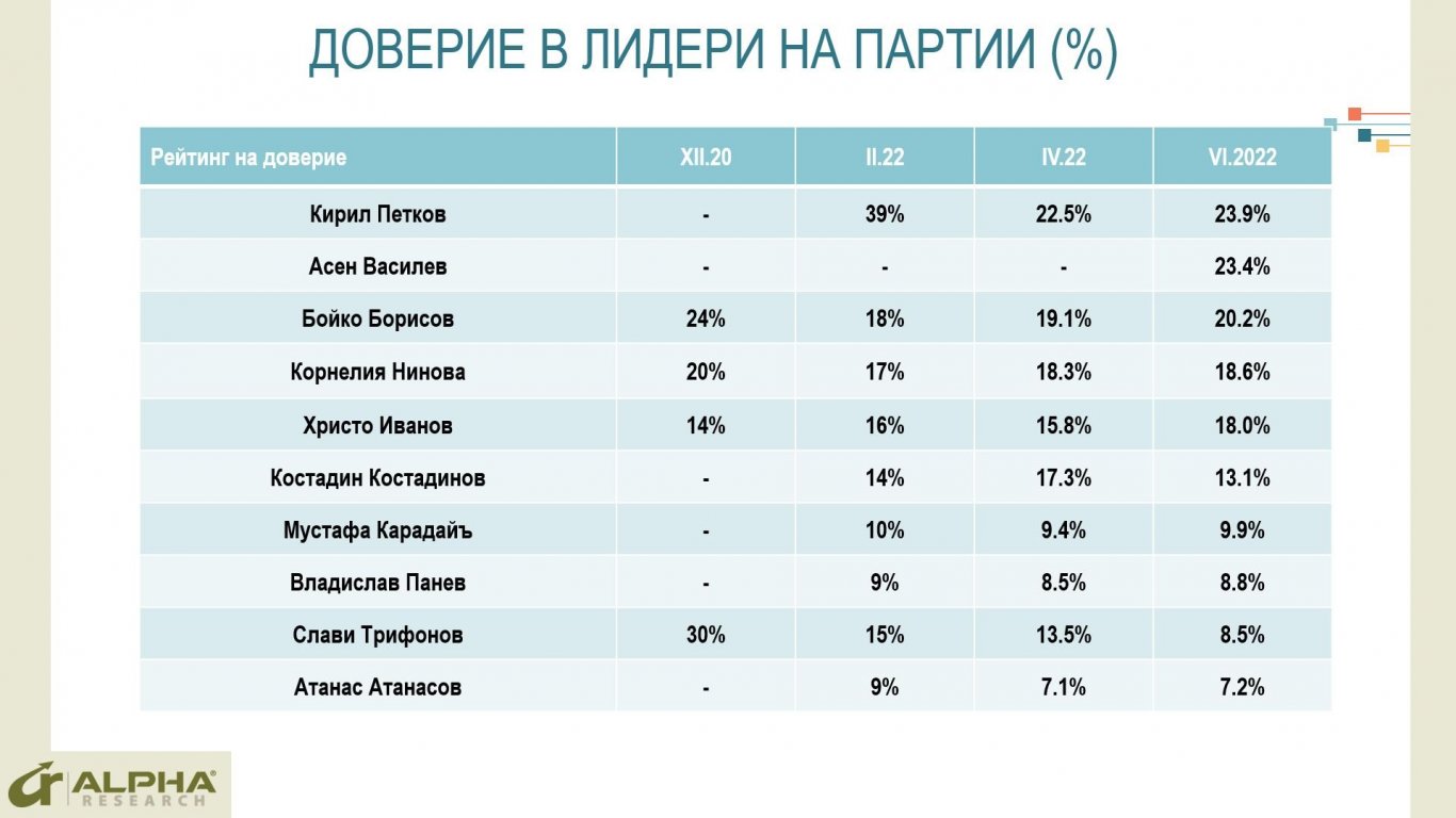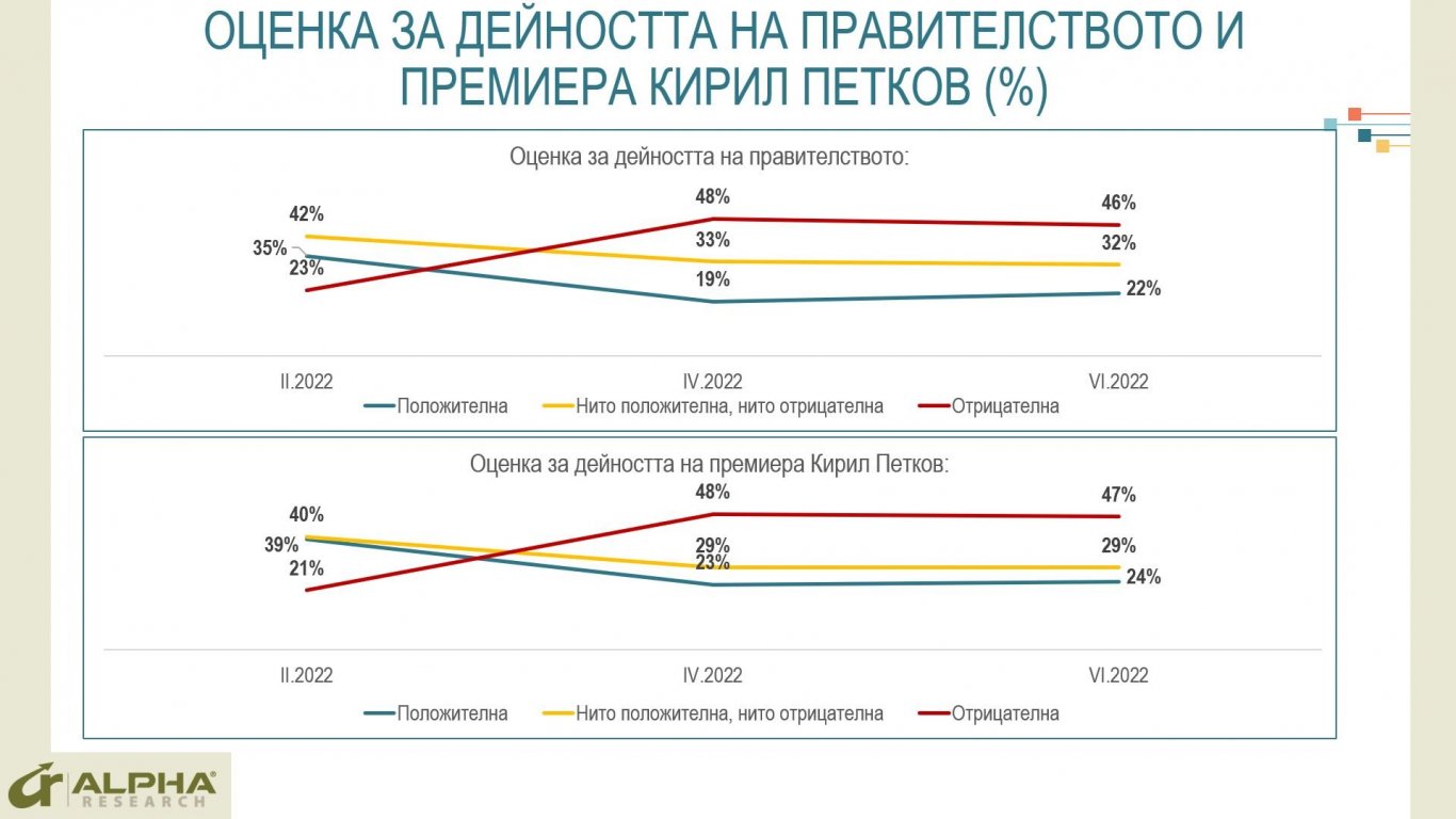 Регулярното тримесечно проучване на Социологическа агенция Алфа Рисърч, проведено в периода 25 юни – 1 юли очертава следните по-съществени тенденции: