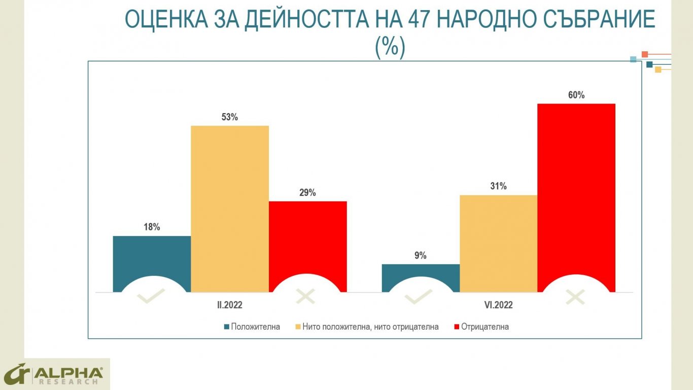 И настоящото, 47 Народно събрание, не успява да се откъсне от печалните рекорди на предишните парламенти. Положително отношение към него имат 8.7% от анкетираните, отрицателно – 60%. Логично, малко по-високo е одобрението сред симпатизантите на управляващата коалиция, но и при тях не надхвърля 15 на сто.