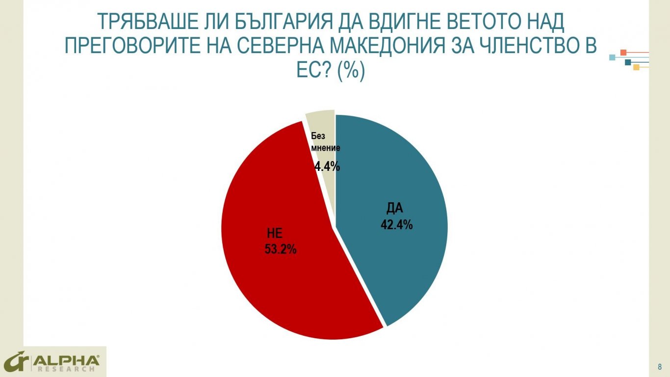 Отпадането на българското вето над започването на преговори на Северна Македония с ЕС не води до предвещаваните от мнозина анализатори обществени катаклизми. Изследването показва, че след вота в парламента на т.нар. „френско предложение“ 42% от анкетираните одобряват вдигането на ветото срещу 53% неодобряващи. Тази рязка промяна в сравнение с настроенията преди няколко месеца ясно показва, че отговорното политическо лидерство е в състояние да доведе до успокоение в обществото и еволюция на обществените нагласи.