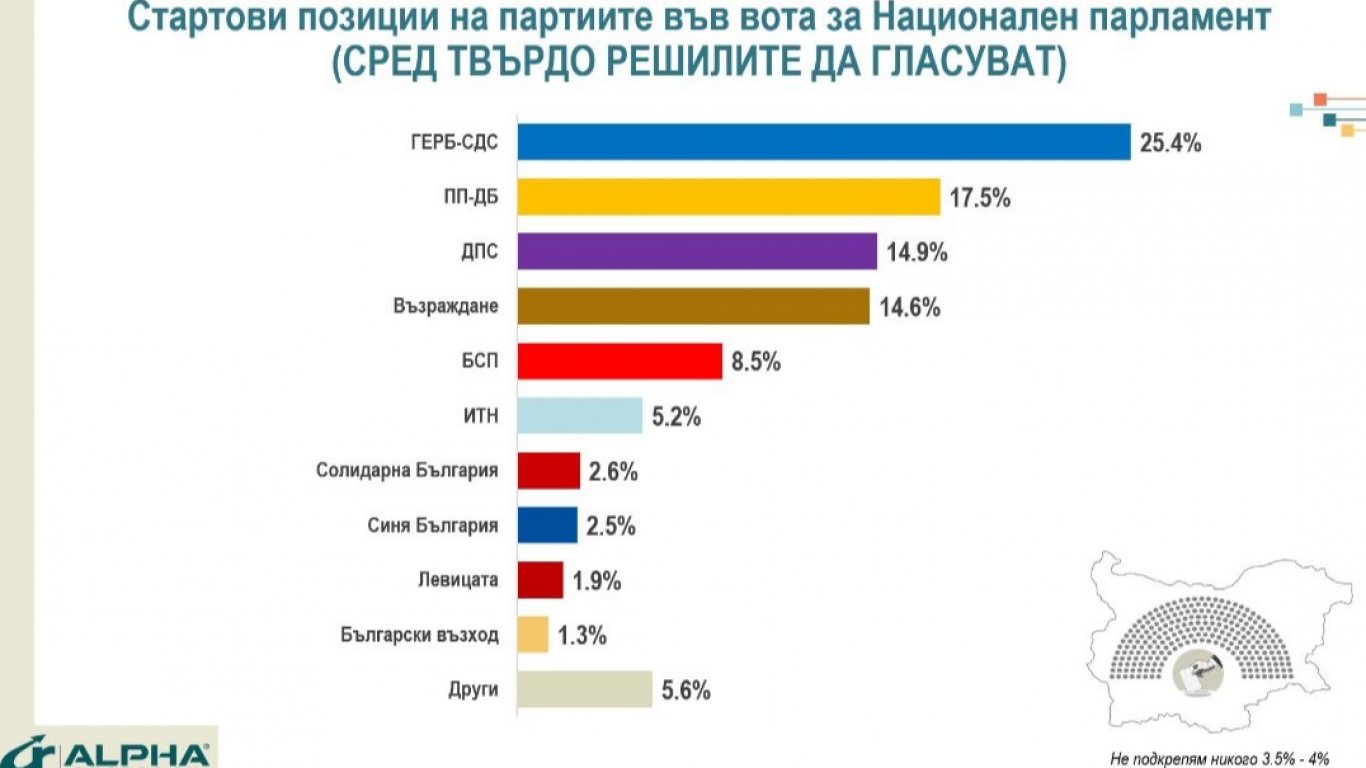 ГЕРБ взема 25,4% на изборите за следващо Народно събрание и води убедително пред ПП-ДБ, които събират 17,5%. В почти равни позиции на старта на кампанията са ДПС и Възраждане“, съответно по 14,9 и 14,6 на сто, БСП се движи около 8,5%, а ИТН – 5,2%.