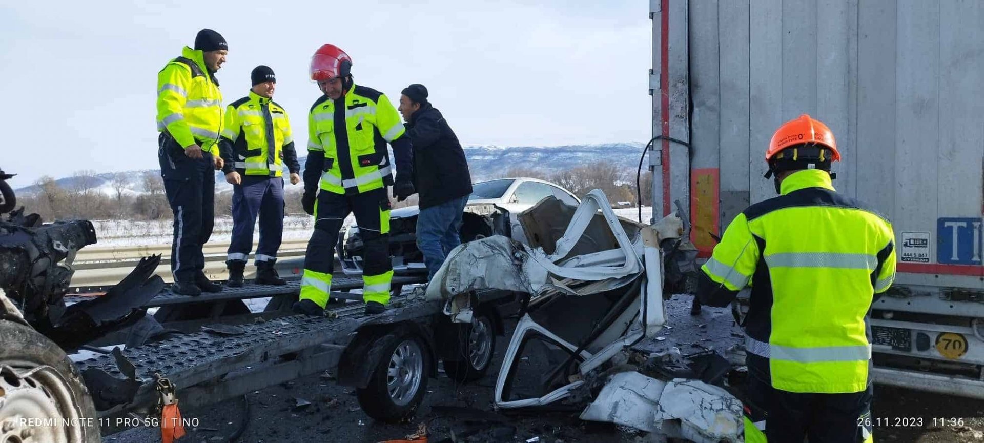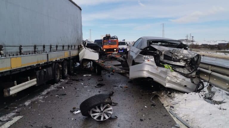 Автовозът се е ударил в камион от колона от принудително спрени тирове на околовръстния път поради лошата метеорологична обстановка.