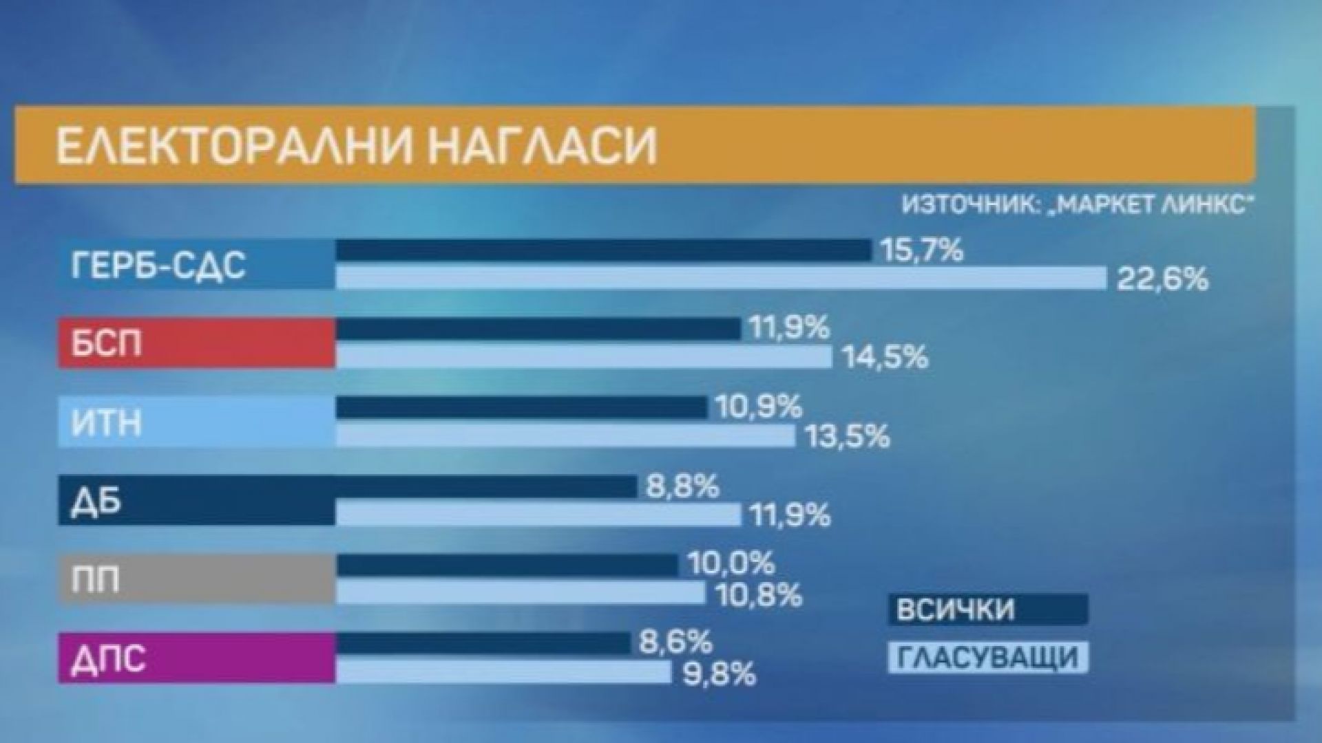 Електоралните нагласи два месеца преди изборите сочат като категоричен победител ГЕРБ, съобщи социологът от „Маркет линкс“ Добромир Живков в студиото на bTV при представянето на последното проучване на социологическата агенция. БСП е на втора позиция, но разликите с ИТН, ДБ и ПП са разлики в рамките на статистическите отклонения.