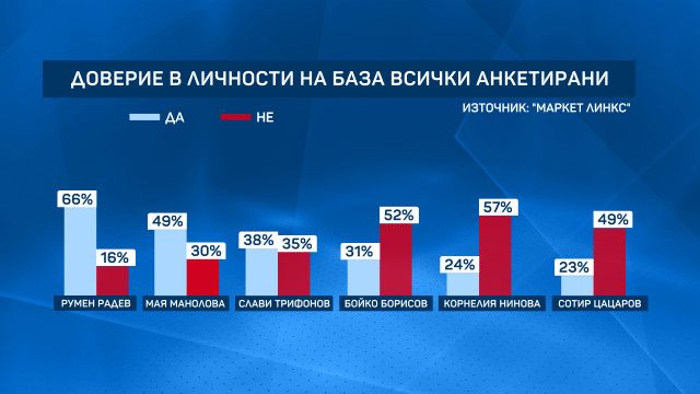 Към момента „Няма такава държава“ получава и най-висок процент на положителни оценки (32% срещу 38% отрицателни), следвана от ГЕРБ и БСП, които обаче събират и много по-високи негативни реакции. Най-одобряваните български политици и личности, свързани с политиката, са Румен Радев (66% доверие, 16% недоверие), Мая Манолова (49% доверие и 30% недоверие) и Слави Трифонов (38% одобрение и 35% недоверие). Премиерът Бойко Борисов е с 31% доверие и 52% недоверие.