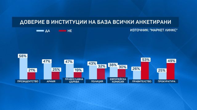 Президентството, армията, църквата, полицията и Европейската комисия са институциите, в които анкетираните имат най-голямо доверие.