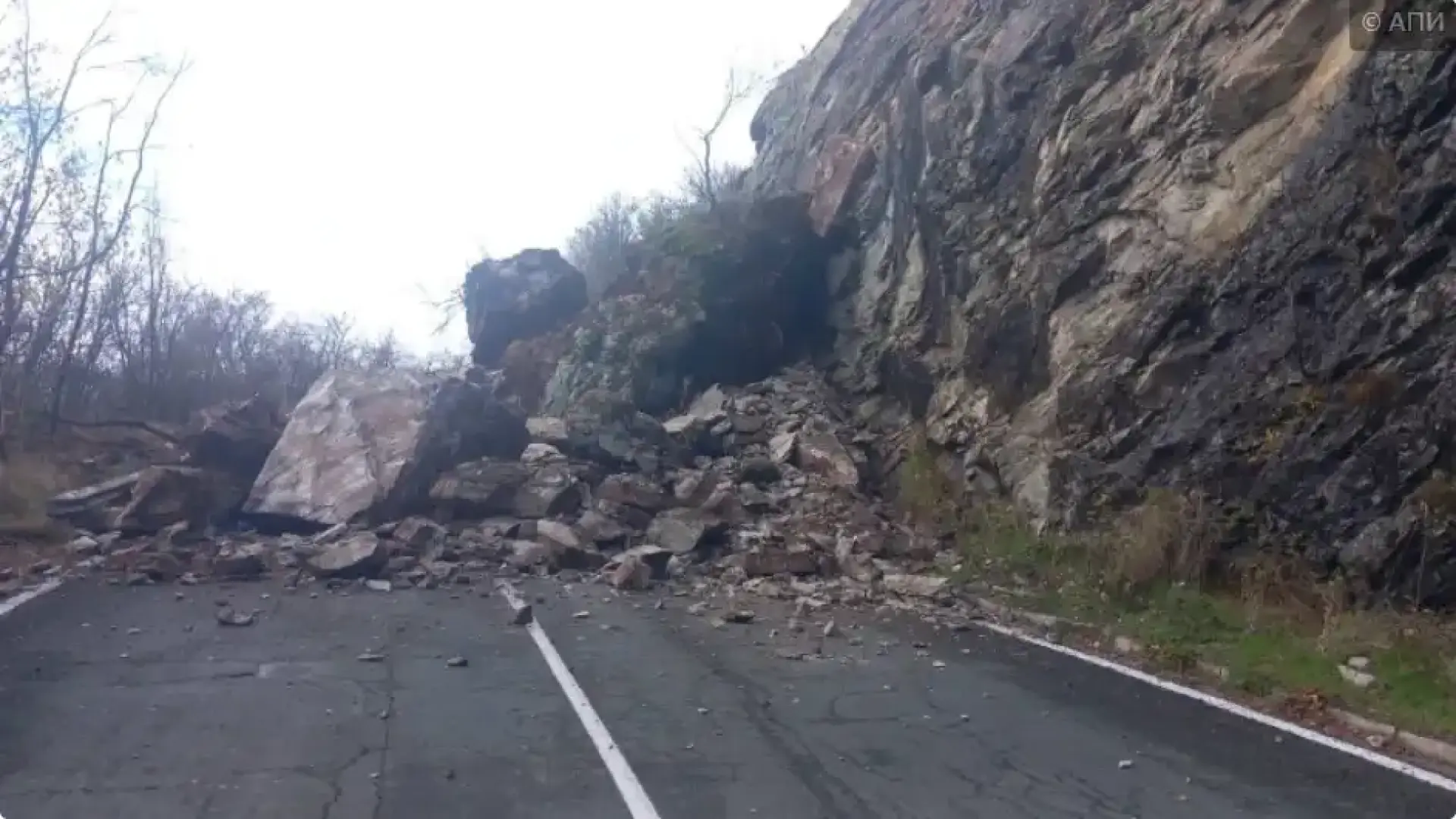 Екипи на пътно поддържащата фирма разчистват свлечената скална и земна маса в района на село Кърнаре.