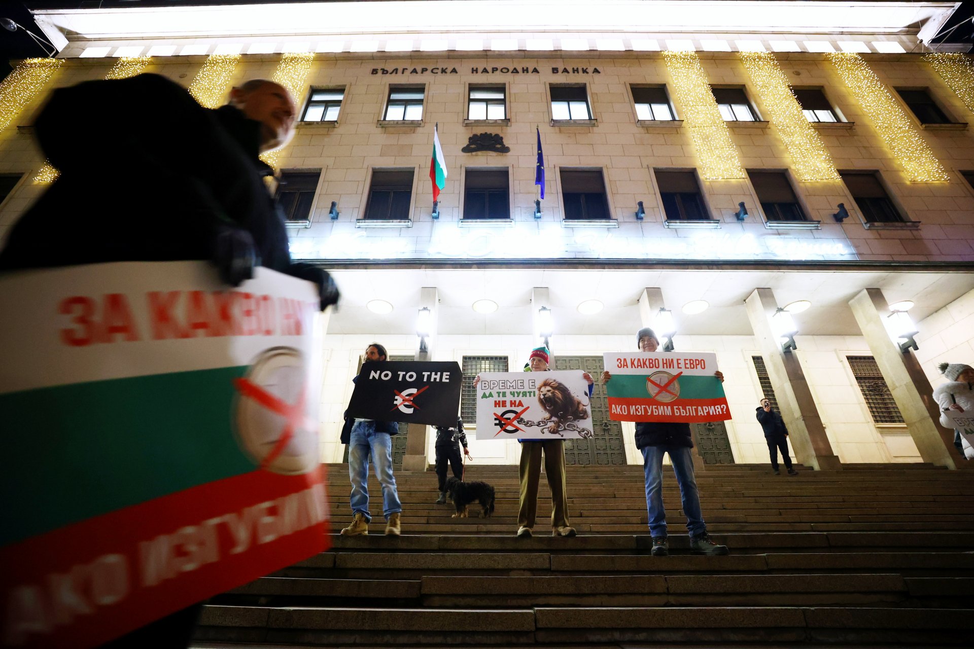 Протестиращи срещу въвеждането на еврото в България се събраха пред сградата на БНБ в центъра на София. Демонстрацията е организирана от Гражданско сдружение „Дойран 2025“.
