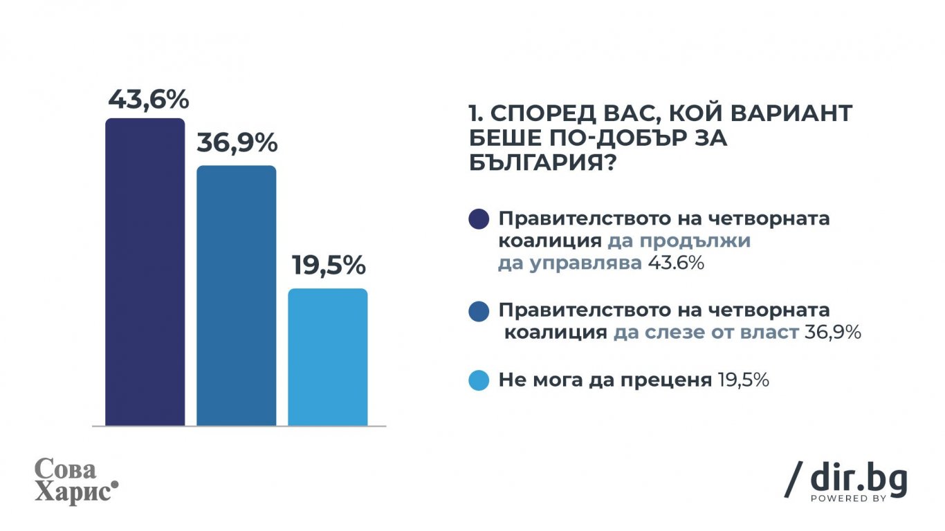 По въпроса дали правителството на четворната коалиция трябваше да продължи да управлява страната или да слезе от власт, общественото мнение у нас е разделено на две големи групи. Разделението в обществото ни е радикално и това предвещава много остър политически сблъсък при провеждането на очертаващите се извънредни парламентарни избори.