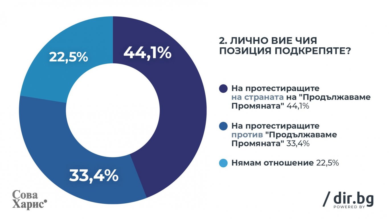 Подобно съотношение регистрираме и по отношение на подкрепата за протестиращите в полза на едната или другата страна – 44.1% симпатизират на „Продължаваме Промяната“, а 33.4% са настроени срещу тях.