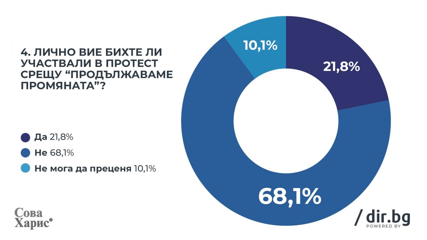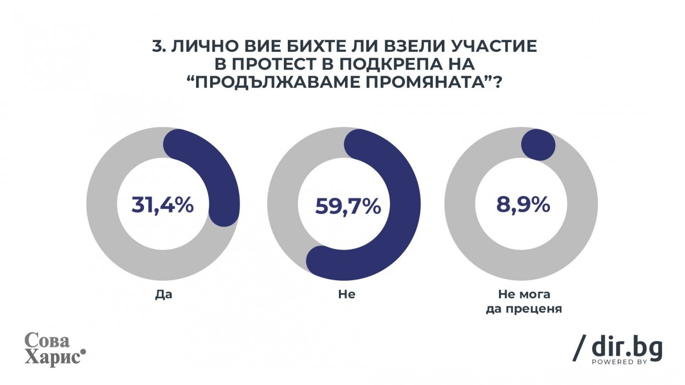 Готовност да вземат участие в протести, подкрепящи политиката на „Продължаваме Промяната“, имат 31.4% от гласоподавателите, докато „срещу“ биха протестирали 21.8%.