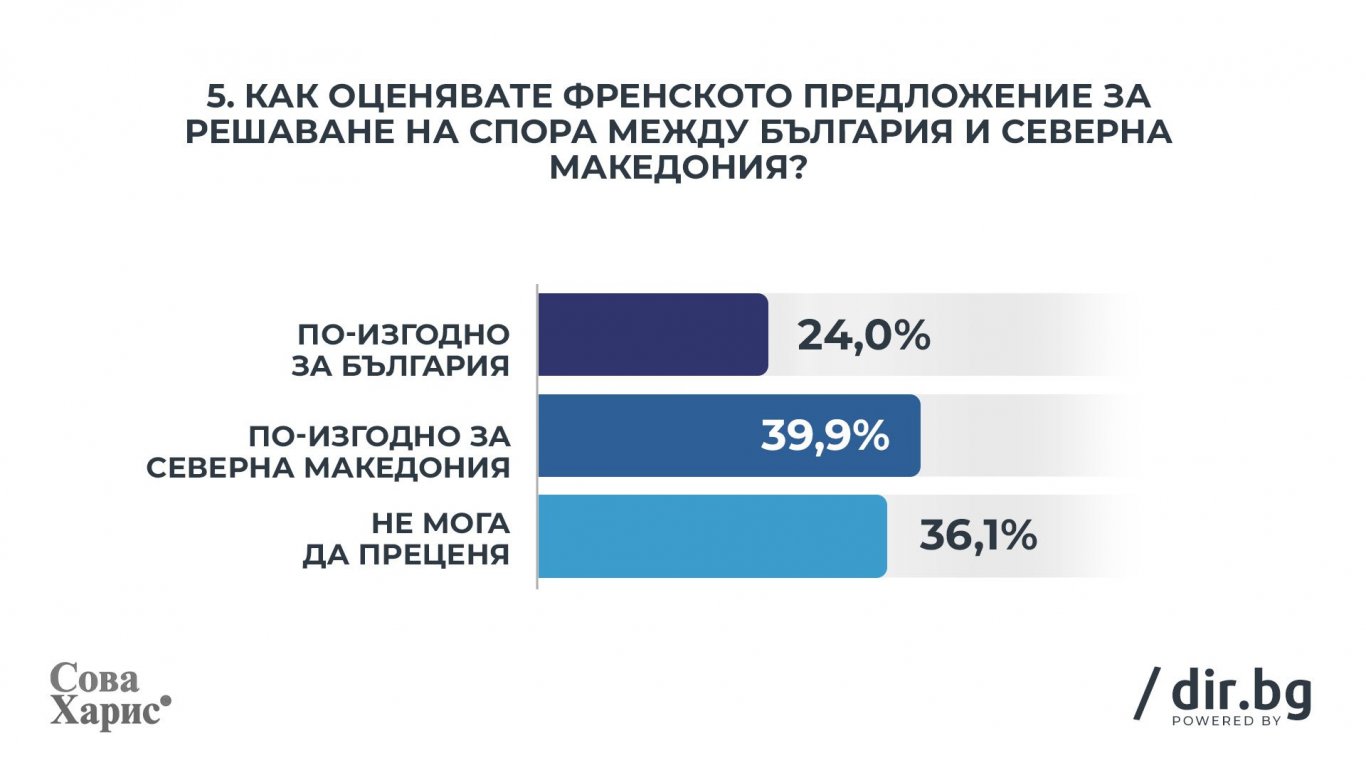 Отзвукът от спора ни със Северна Македония се очаква да позаглъхне. Със сигурност някои от участниците в изборната надпревара ще го поставят на централно място. В сегашната ситуация изглежда изненадващо, че по-голямата част от избирателите възприемат френското предложение като по-изгодно за западните ни съседи (39.9%), отколкото за България (24.0%). Това показва, че широката аудитория засега гледа на въпроса като на футболен мач (по френски) и за нея е важно кой ще се наложи, а не какви са перспективите в по-далечно бъдеще.