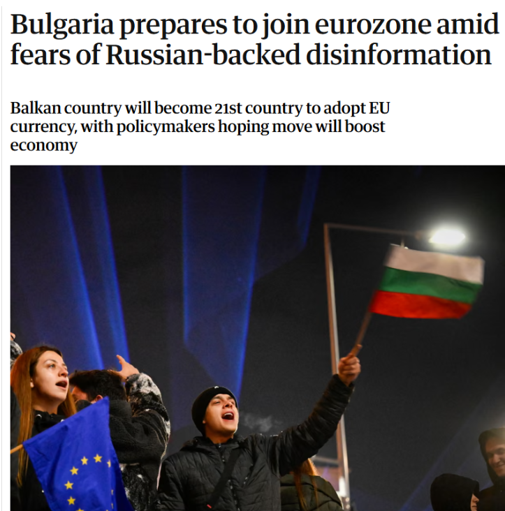 Докато Брюксел говори за икономически растеж, инвестиции и „качествени работни места“, България влиза в еврозоната разкъсана между страхове от поскъпване, политическа нестабилност и активни кампании за дезинформация с руска следа. Така описва ситуацията The Guardian в обстоен репортаж от София, публикуван дни преди страната да приеме еврото.