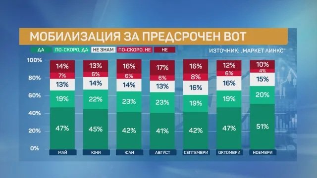 „Очевиден е сериозният спад в дела на подкрепа за ГЕРБ, като в последния месец е намалял с 5%“, посочи социологът от „Маркет линкс“ Добромир Живков. Наблюдава се мобилизация на подкрепящите ПП-ДБ. „Възраждане“ остават устойчиви, а при „ДПС-Ново начало“ също има спад с около 4%, добави той.